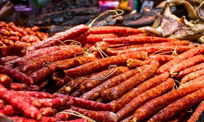 Lạp xưởng Lệ Giang là món đặc sản truyền thống mà du khách sẽ bắt gặp ở hầu hết các khu chợ và nhà hàng địa phương. Không giống với lạp xưởng ở các vùng khác, lạp xưởng nơi đây mang hương vị đậm đà, được chế biến từ thịt lợn hoặc thịt bò tươi, tẩm ướp kỹ với muối, rượu gạo, hoa tiêu Tứ Xuyên, ớt khô và nhiều loại gia vị bản địa. Sau đó, thịt được nhồi vào ruột và đem phơi khô dưới nắng hoặc hun khói, tạo nên màu sắc bắt mắt và mùi thơm đặc trưng.
