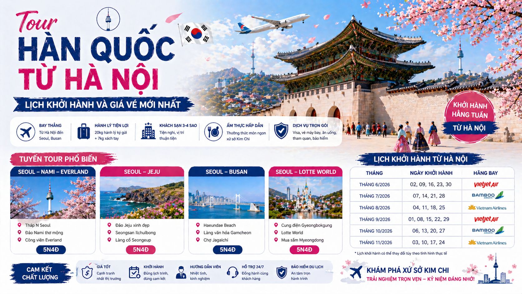Bạn đang mơ về một chuyến đi tour Hàn Quốc từ Hà Nội để đắm chìm trong sắc hoa anh đào hồng rực, cảm nhận nhịp sống hiện đại xen lẫn truyền thống? WonderTour mang đến những hành trình tour Hàn Quốc khởi hành từ Hà Nội bay thẳng từ sân bay Nội Bài, giúp bạn tận hưởng trọn vẹn mọi khoảnh khắc đẹp nhất tại xứ sở kim chi mà không phải lo lắng về di chuyển hay thủ tục.