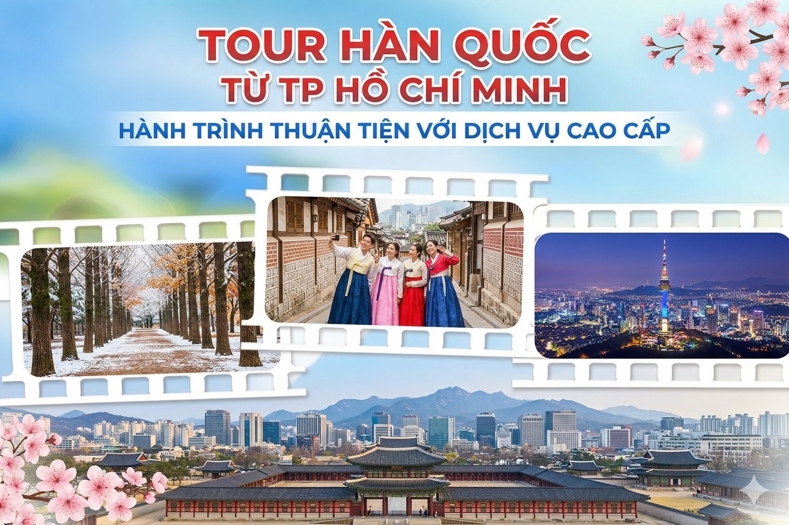 Nếu bạn đang tìm tour Hàn Quốc từ TP Hồ Chí Minh, các gói phổ biến thường kéo dài 5-6 ngày 4-5 đêm, giá dao động từ 15-25 triệu đồng/người (tùy mùa và hạng khách sạn). Điểm cộng lớn là dịch vụ cao cấp: xe đưa đón riêng, trải nghiệm mặc hanbok, làm kim chi, ngắm hoa theo mùa.