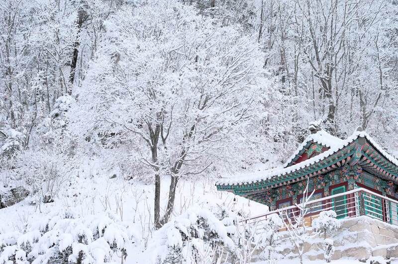 Cung điện Gyeongbokgung là biểu tượng lịch sử của Seoul, được xây dựng từ thế kỷ 14. Vào mùa tuyết, mái ngói, sân và các công trình trong cung điện đều phủ trắng, tạo khung cảnh lãng mạn và cổ kính.