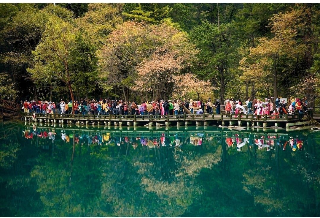 Thiên đường hạ giới Cửu Trại Câu – một vùng núi non hùng vĩ ở độ cao 4.000m so với mặt nước biển, có cảnh quan thiên nhiên được xếp vào loại độc nhất vô nhị ở Trung Quốc. Đến đây, du khách sẽ choáng ngợp trước vẻ đẹp của hàng trăm hồ nước lớn nhỏ từ các ghềnh thác đổ về. Đặc biệt màu nước trong hồ có thể thay đổi tùy theo ánh sáng của mặt trời phản quang vào buổi sáng hay buổi chiều.